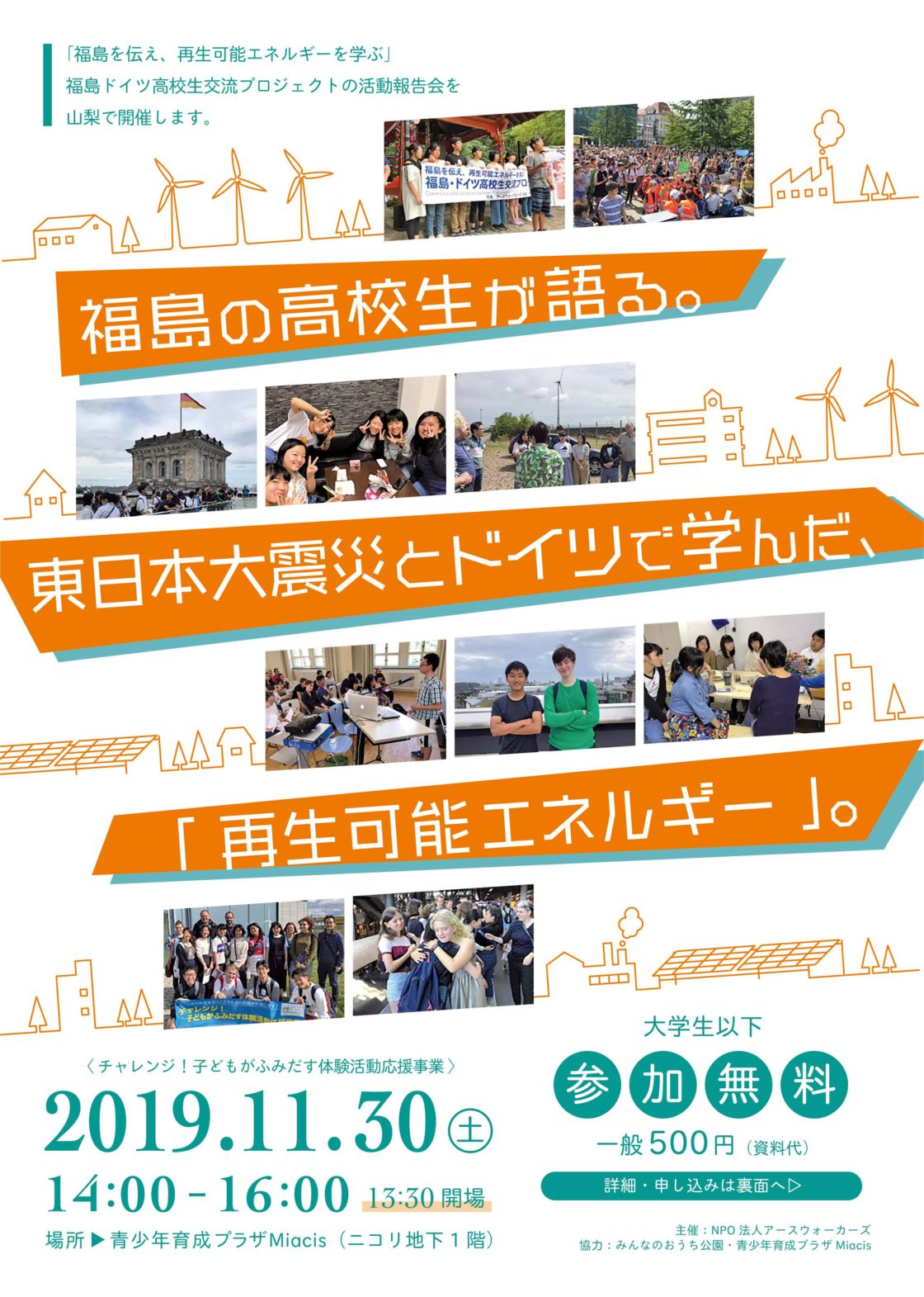 福島・ドイツ高校生交流プロジェクト 2019.11.30 イベント 11月30日、韮崎の青少年育成プラザMiacis(ニコリ地下1階)にて、福島在住の高校生による“福島を伝え、再生可能エネルギーを学ぶ”『福島・ドイツ高校生交流プロジェクト』(主催:アースウォーカーズ)が開催されました。 みんなのおうち公園は、協力として無農薬・無化学肥料にて収穫した武川米をおにぎりにし、提供をしました。